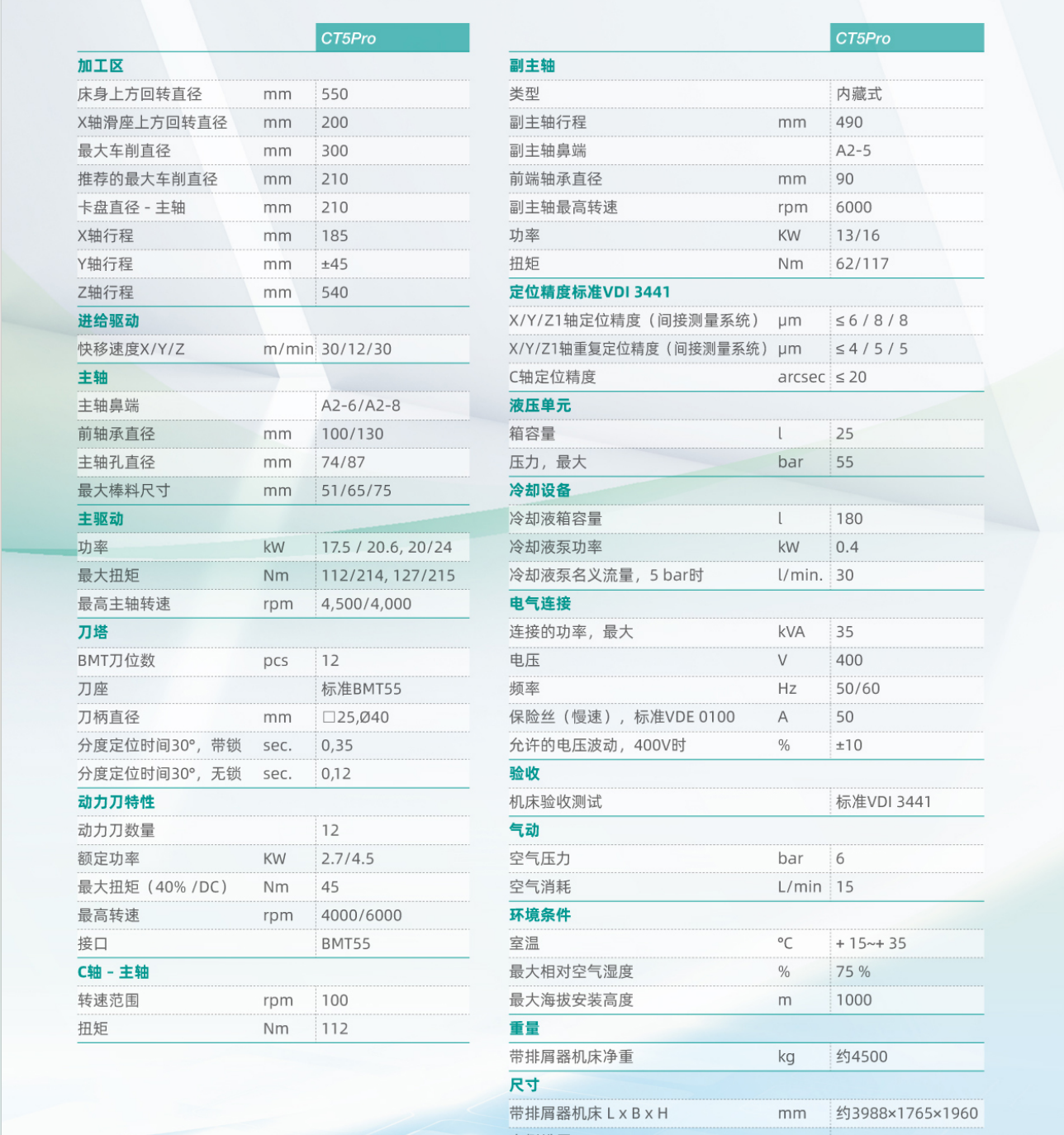 CT5 Pro 雙主軸雙刀塔機型,正副主軸標配電主軸,正主軸4500rpm,副主軸5000rpm。上下刀塔標配12T,BMT55動力刀塔;上下刀塔帶Y軸,Y軸行程為±45mm。